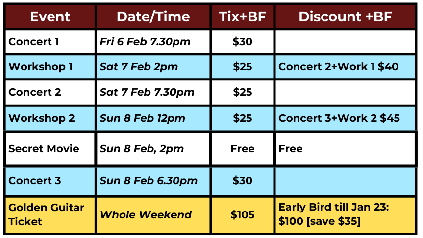 Immerse yourself in the Weekend with a Golden Guitar Ticket for all 3 concerts plus 2 workshops that’s only $105, a saving of $30. To book a Golden Guitar Ticket visit the first concert Link: bit.ly/cgwconcert1